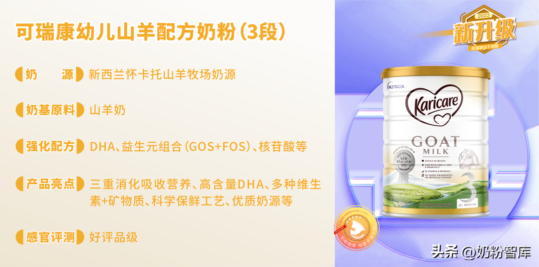 • 好产品离不开好品牌,品牌力也是家长们选择奶粉的重要维度。Karicare (可瑞康)是达能婴幼儿营养品纽迪希亚(NUTRICIA)奶粉品牌,是起源于1896年,发源于新西兰,现已成为新西兰和澳大利亚市场的畅销品牌。超百年生命早期营养研究及科研、超20年的羊奶研究沉淀,让其羊奶配方拥有临床研究报告,品质更有保障。
